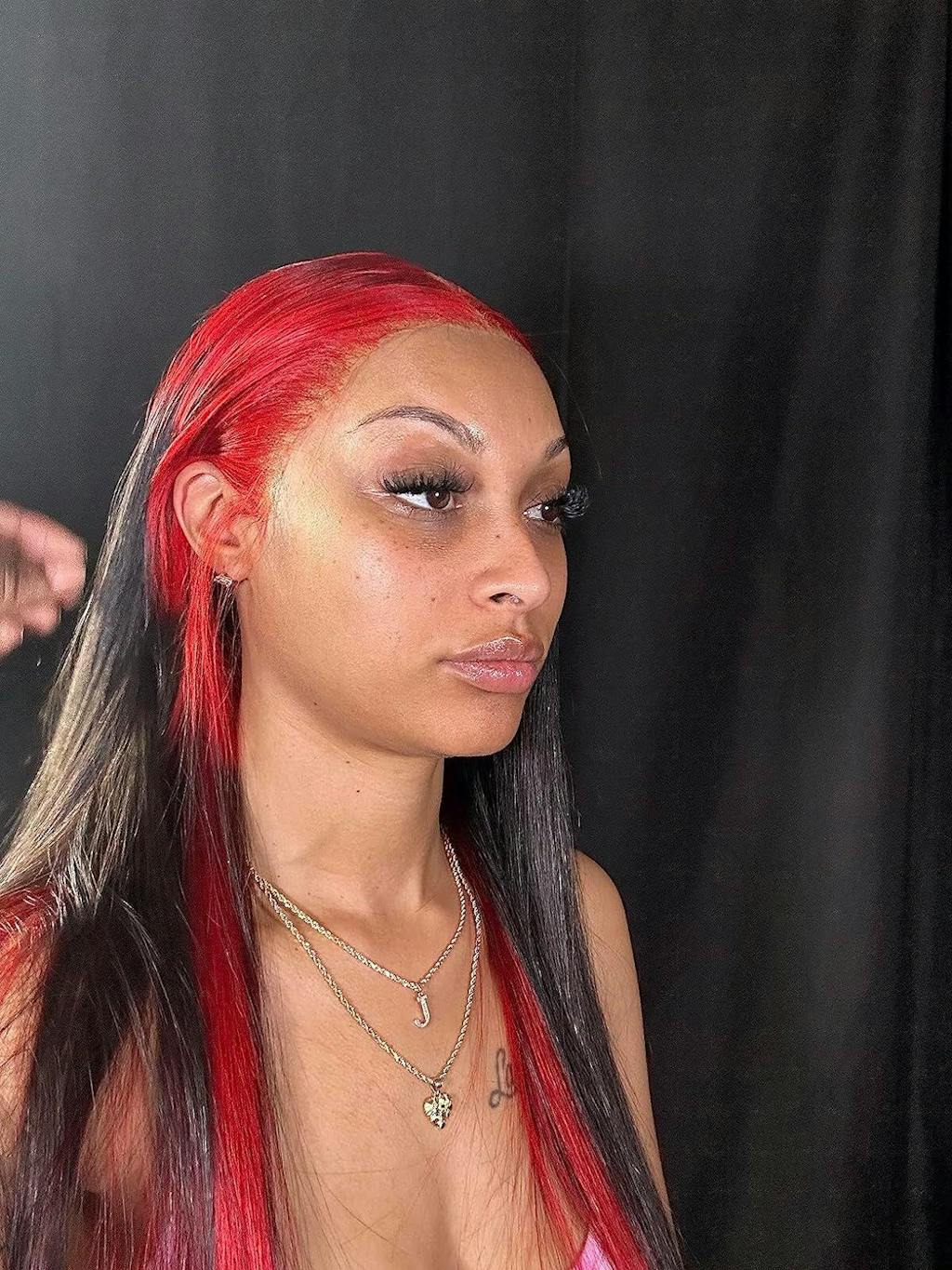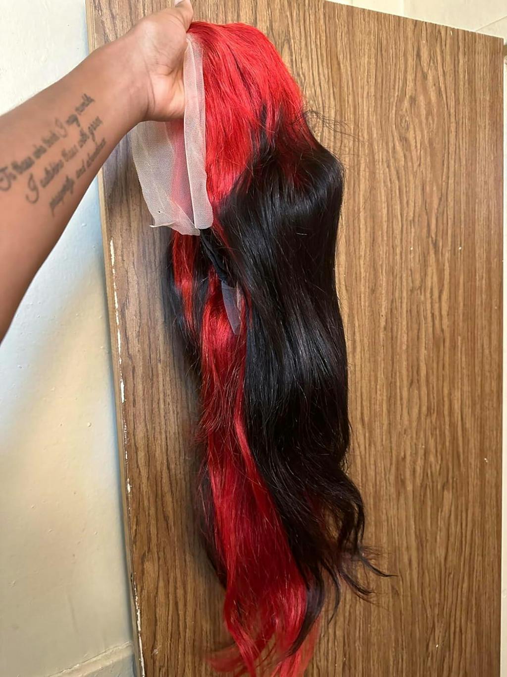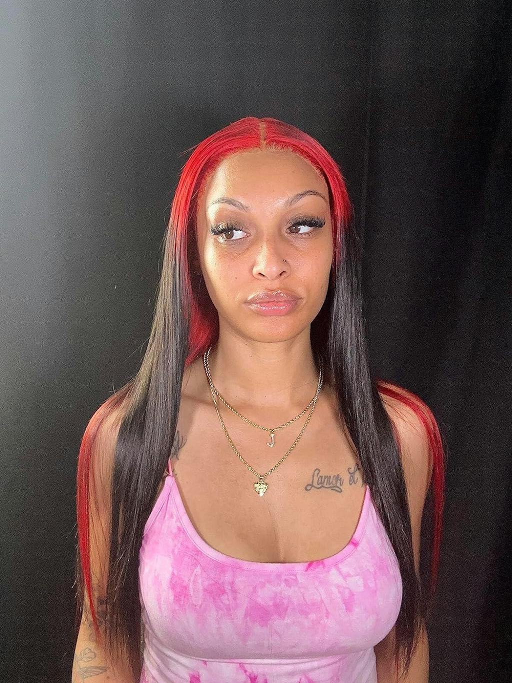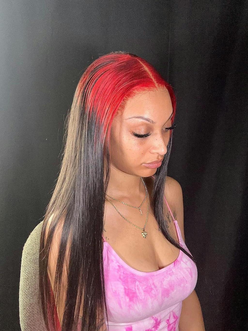 Hair color: Ombre Red Black Highlights, Red Wig, Skunk Stripe Hair