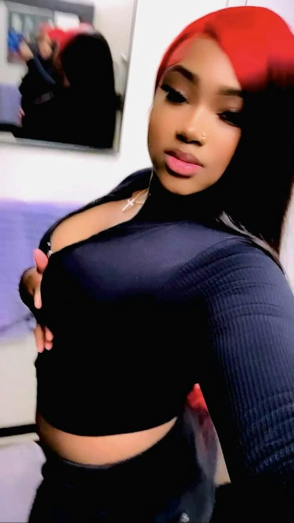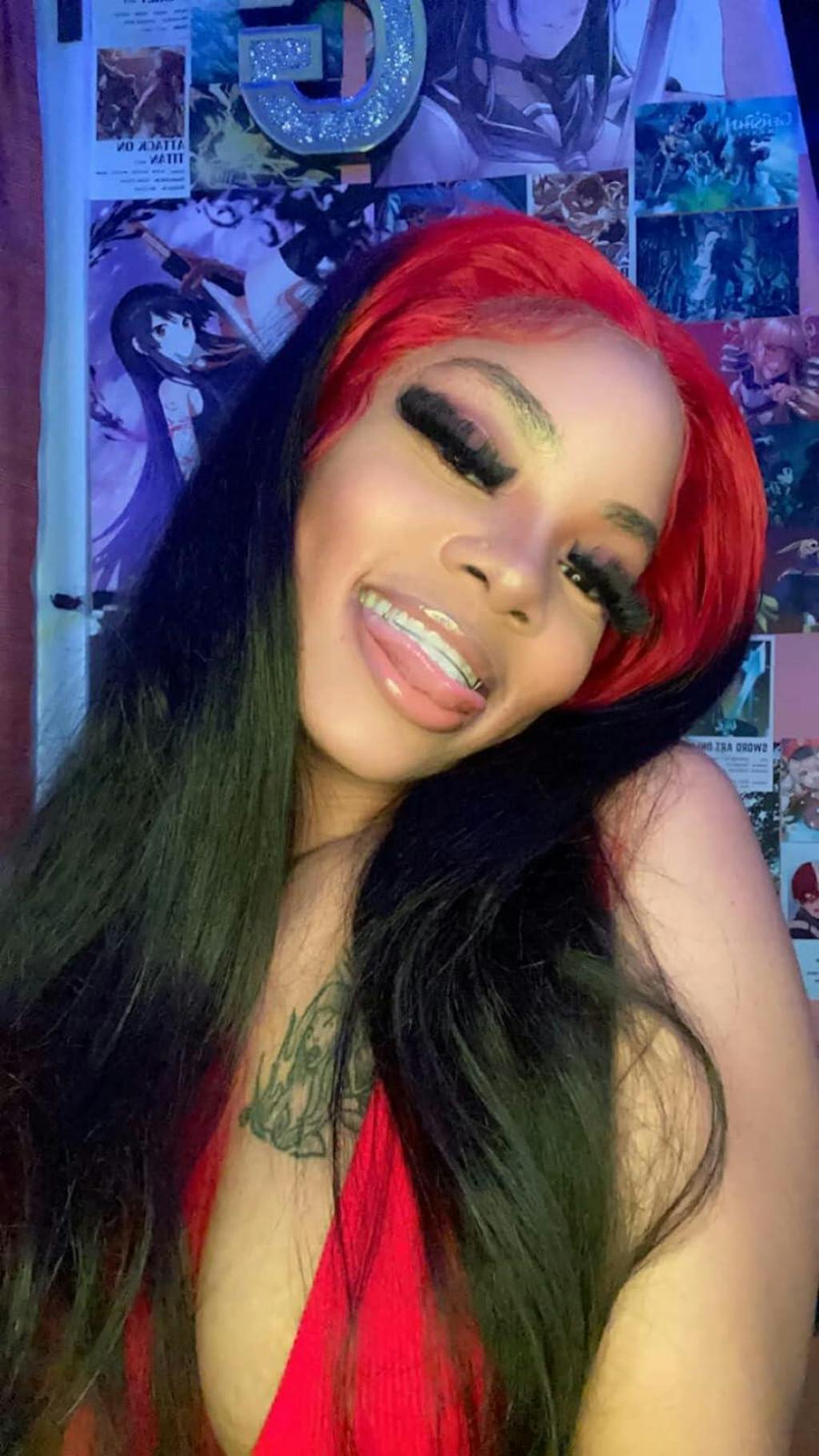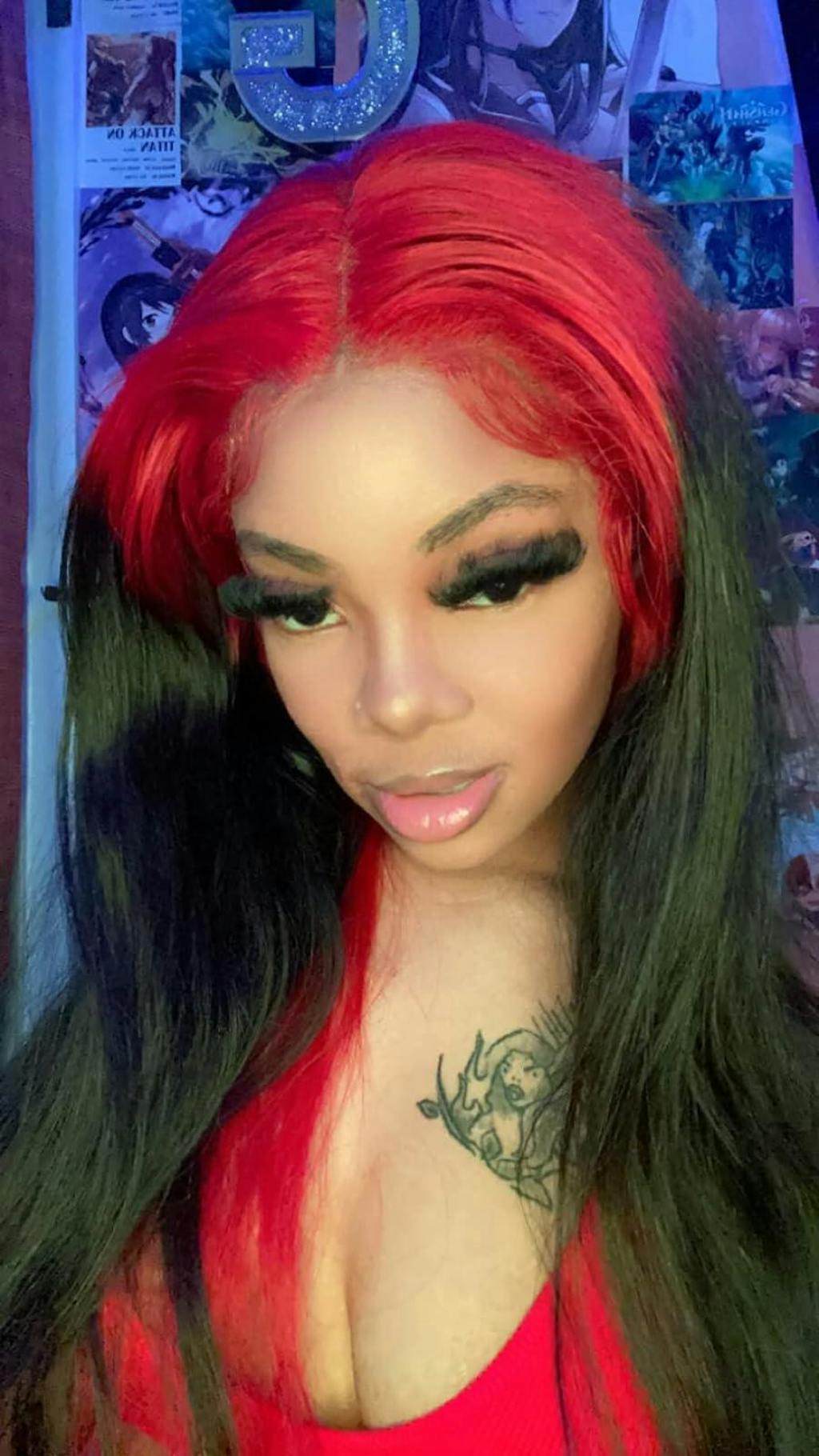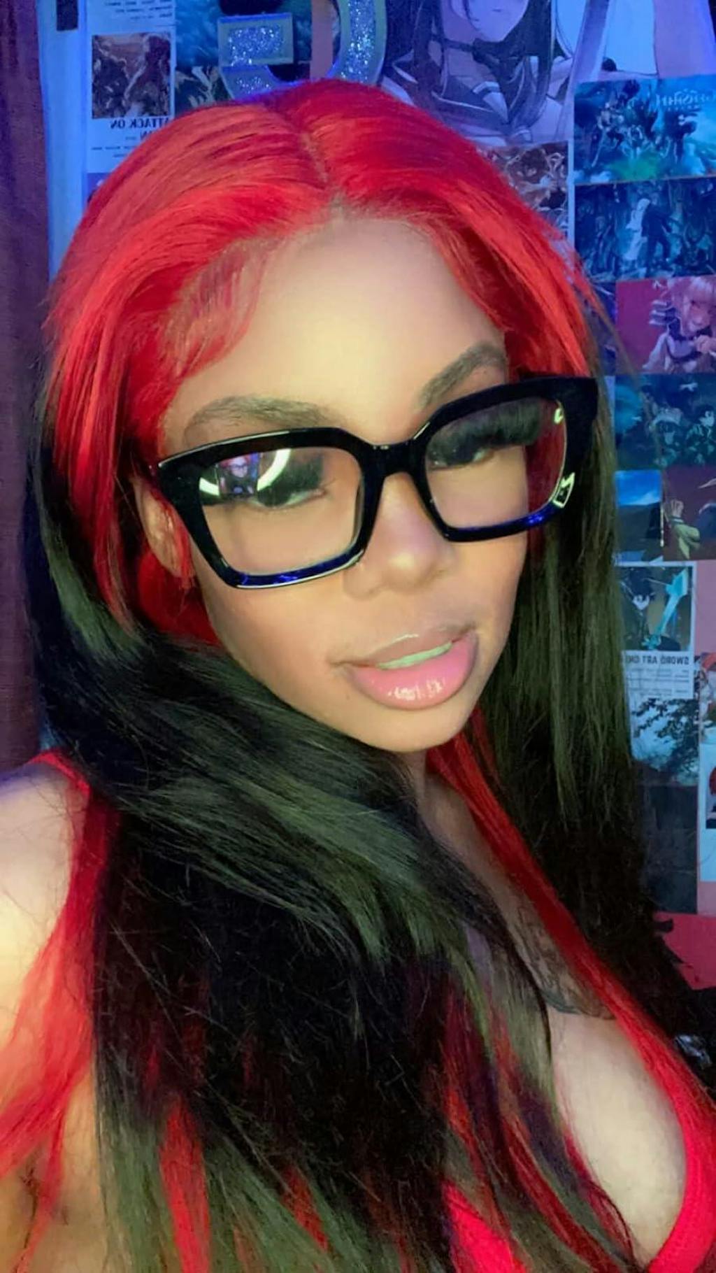 Hair color: Ombre Red Black Highlights, Red Wig, Skunk Stripe Hair