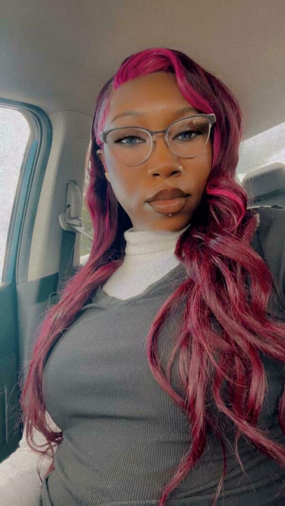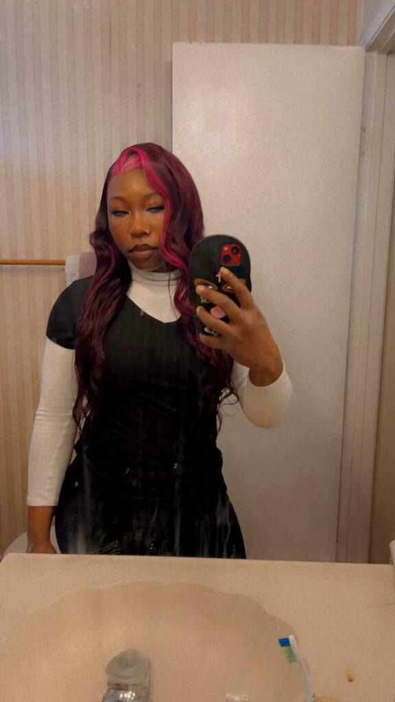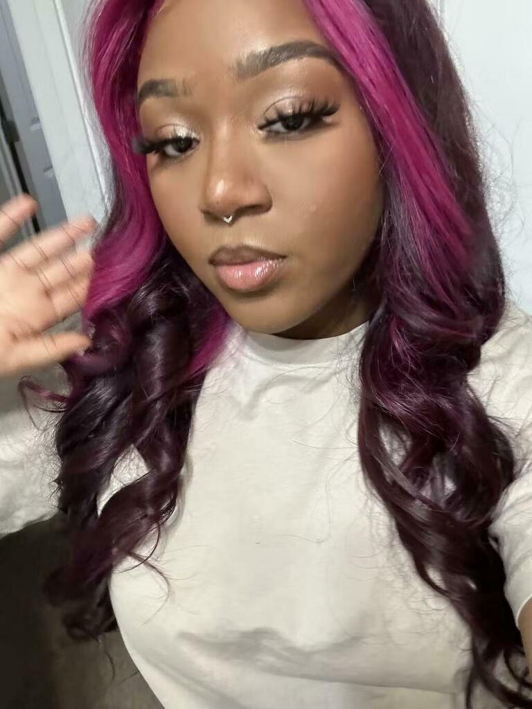 Hair color: Purple Pink Human Hair Wig Skunk Stripe,Balayage Highlights Wig, Skunk Stripe Hair