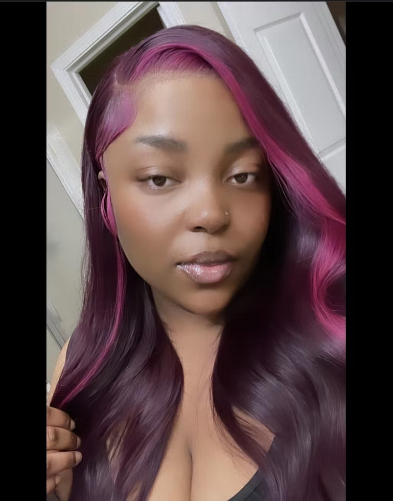 Purple Pink Human Hair Wig Skunk Stripe Lace Front Wigs Pink Streak At Front