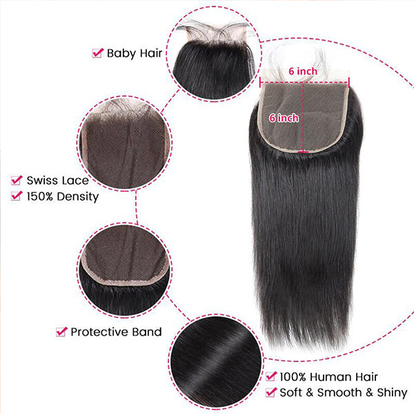 6x6 Lace Closure with Bundles Brazilian Straight Human Hair 3 Bundles with Closure